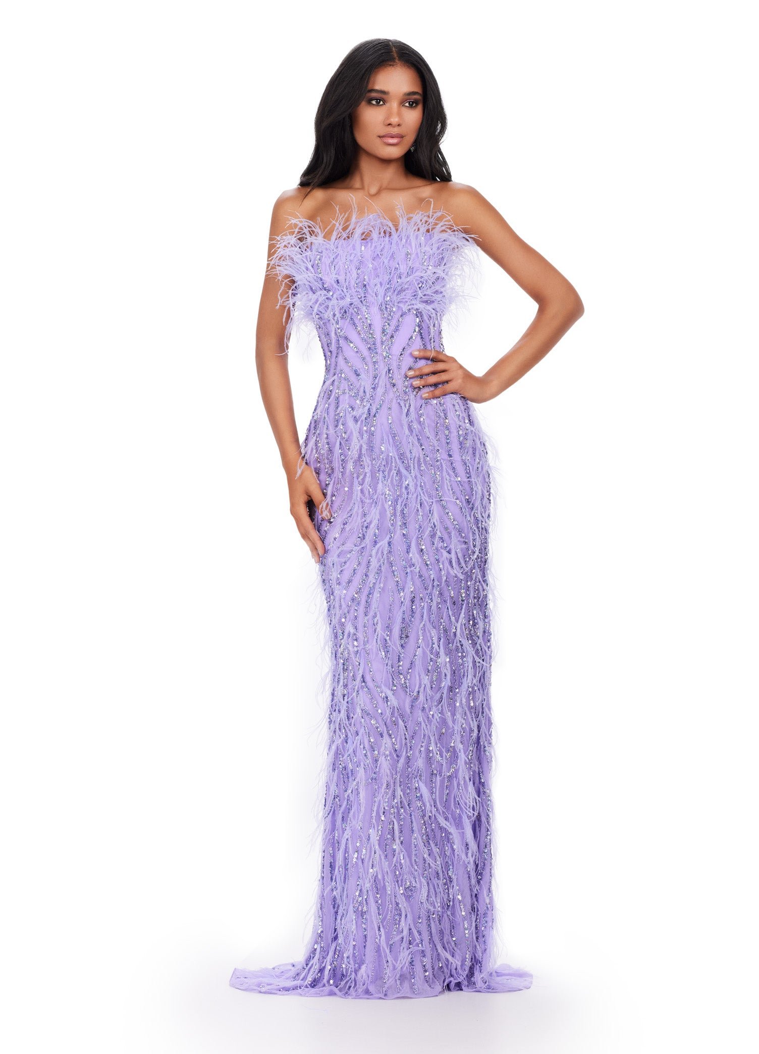 Featuring a fully beaded strapless design. the gown showcases intricate beadwork that creates a luxurious pattern. ensuring a dazzling effect with every step. The playful feather accents bring drama and texture. adding a fun and high-fashion edge to the look.